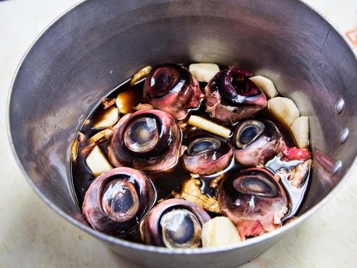 Tuna Eyeballs are a delicacy in Japan and China. They are boiled for a few minutes and usually served with sauce and garlic. Many say the best way to enjoy them is when the eyeball is removed from the fish but retains its fat and the surrounding eyeball. Despite being considered one of the world's most bizarre foods, tuna eyeballs are rich in nutrients such as omega-3, DHA, which are beneficial for the brain and eyes. However, trying a 'live eyeball' is not an easy feat.