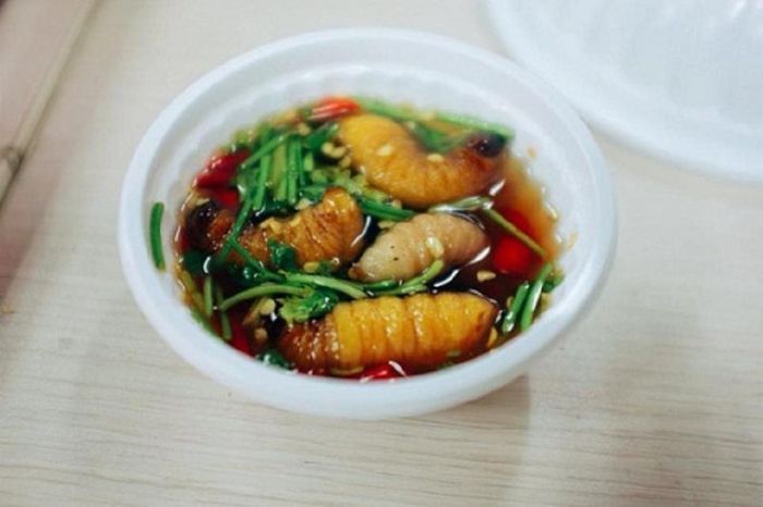 Coconut worms are a specialty of the Mekong Delta, Vietnam, a dish that sends shivers down the spine of diners. Coconut worm soaked in fish sauce is a terrifying dish that not everyone has the courage to taste. Coconut worms soaked in fish sauce consists of live coconut worms soaked in a bowl of salty fish sauce, seasoned with chili and herbs. The sight of live coconut worms wriggling in the fish sauce looks daunting, yet this dish is clean and nutritious. Coconut worms are a rare delicacy found in select restaurants and are often priced very high.