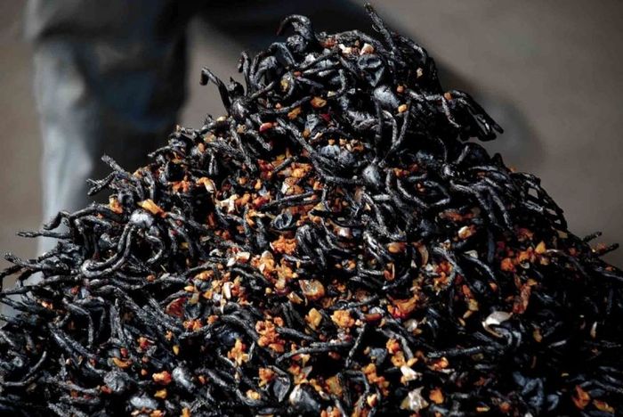 According to the cooking process, the big black spiders are mixed evenly in sweet flour, salt, pepper, sugar, garlic, then fried in oil or can be coated with flour before frying. Contrary to what many people think, spider meat is not at all smelly but rather delicious, chewy, and crispy after processing. Crispy fried black spider is a dish worth trying for those who are extremely adventurous when traveling to Cambodia.