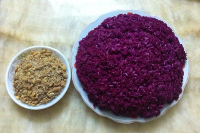 Purple sticky rice from Lang Son gets its purple color from boiling with a special type of leaf called the purple leaf, harvested mostly in April and May. After boiling, the purple leaf water is soaked with glutinous rice overnight. The originally white glutinous rice grains will turn purple, jokingly referred to by many as being 'dyed purple' due to the leaf's coloration. The color of the purple sticky rice is the same as the color of the soaked glutinous rice grains.