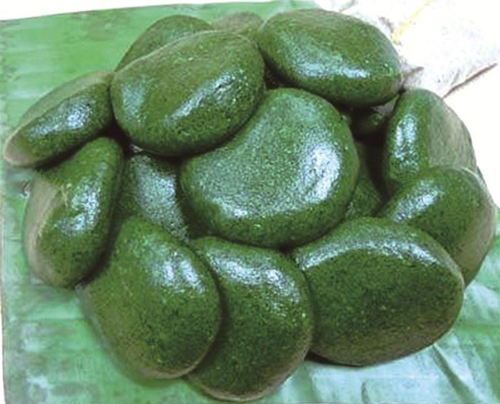 For ngai cake, people in the northern mountainous region often simmer young ngai leaves with clean ash water until soft, then rinse, remove the fibers, and pound them into a smooth paste. The cooked rice is also pounded in the mortar together with the finely ground ngai leaves. The pounding process starts when the rice is piping hot until it becomes a soft, smooth, and elastic dough, then it's ready for shaping cakes. Another way to process the leaves is to boil them in lime water to preserve their green color, then drain and pound them until smooth along with the rice until it becomes a fine powder.