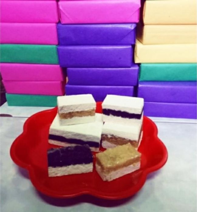 The mixed flour and sugar/molasses are placed in molds, with a layer of filling made from sesame seeds or mung beans evenly spread on top. After sprinkling the final layer of flour on top of the filling, the cakes are compressed into molds, forming a solid block. Finally, the cakes are packaged and wrapped.