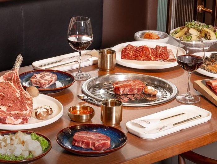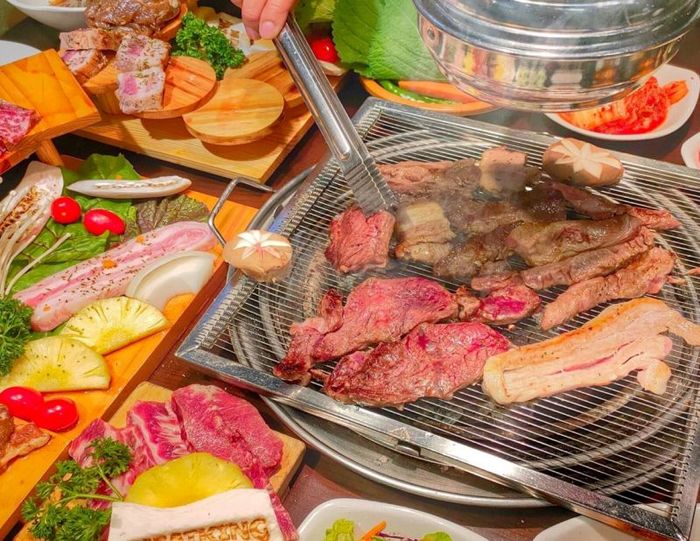 Gogi House is a barbecue restaurant with a street-style atmosphere, offering a unique twist by marinating its dishes with authentic Vietnamese flavors. The restaurant features a blend of traditional charm with modern luxury. The staff, dressed in traditional attire, provide professional service. The menu includes a variety of dishes such as sweet potato fries, French fries, spring rolls, salads, side vegetables, pork belly, pork shoulder, chicken, seafood like fish roe, squid tentacles, octopus, and a buffet that includes free iced tea. The grilled flavors are perfectly seasoned, giving the dishes a distinctive taste that stands out.
