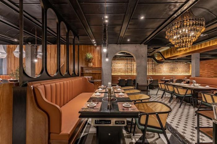 Located in a villa designed in an 80s retro style, Bò Tơ Quán Mộc has brought a fresh wave to Hanoi's culinary scene with its tender dishes made from young beef. The restaurant’s charming ambiance is marked by red brick walls, green window frames, bright red tiled roofs, wooden tables, and vibrant red peacock curtains. Despite its nostalgic feel, the place is warm and inviting, making it an ideal spot for a cozy year-end party with a personal, heartfelt atmosphere for all company members.