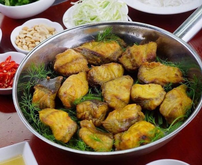 Chả cá, a delicious specialty from the heart of Hanoi, is a must-have dish for your year-end party menu. To experience the best version of this dish, I recommend visiting Vua Chả Cá, located on Nguyễn Thị Định street.