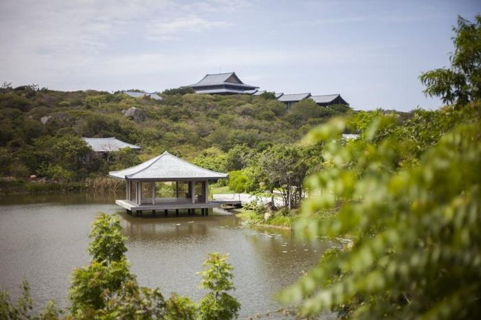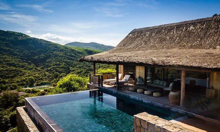 The luxurious Amanoi hotel spans 100 hectares and was designed by Jean-Michel Gathy of the Kuala Lumpur-based architecture firm Denniston. It includes a Central Pavilion, inspired by a traditional Vietnamese communal hall. There are two pools, a Rock Pool next to the Central Pavilion, and one at the Beach Club. Amanoi comprises 31 standalone villas. It also includes five villas with shared kitchens and butlers, resembling traditional Vietnamese village houses.