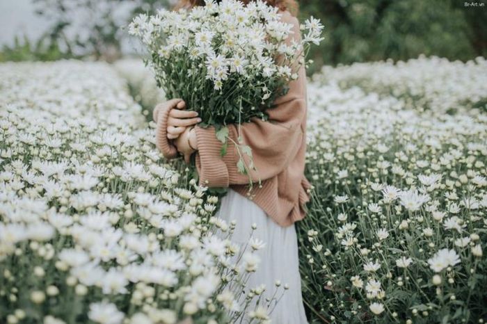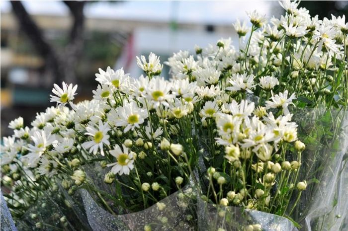 Chrysanthemums are scattered around the areas near the Hong River's stone embankment, particularly in the Nhật Tân district, just after the Quảng An flower market in Tây Hồ. The beauty of these flowers is not defined by endless fields, but by the flower vendors who wander the streets of Hanoi. Their pristine white petals stand out against the pale golden sunlight of late autumn.