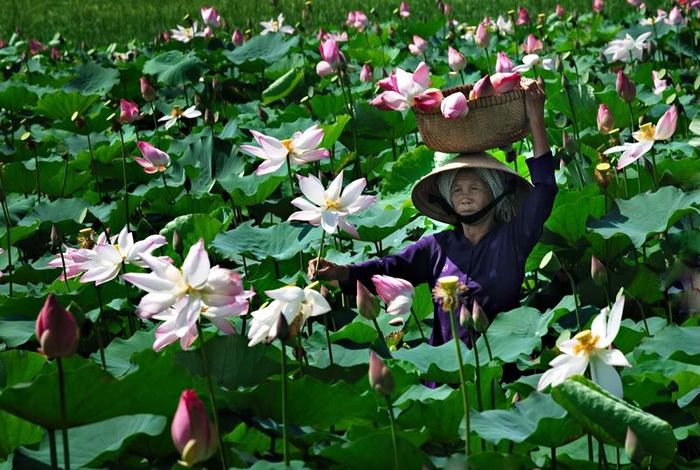 During the rainy season, wild lotuses bloom in abundance along the rivers, canals, lowlands, and ponds of Long An, Vĩnh Long, Đồng Tháp, Mỹ Tho, Cần Thơ, and Bạc Liêu. The lotuses here are primarily a mix of the deep red lotus and the more common white wild lotus. The resilience of this plant is astonishing. Without any care, it simply buries its roots deep into the ground and grows with the rising waters. As the floodwaters rise, so do the lotus flowers. This is why, when the flood season arrives, locals gather to harvest the long stems of these striking flowers.