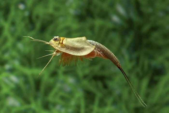 Although it thrives in freshwater, many species of tadpole shrimp can also live in dry, desert environments where rainfall is scarce. These ancient creatures are easily identifiable by their horseshoe crab-like head, long segmented tail, and two long antennae pointing backward.