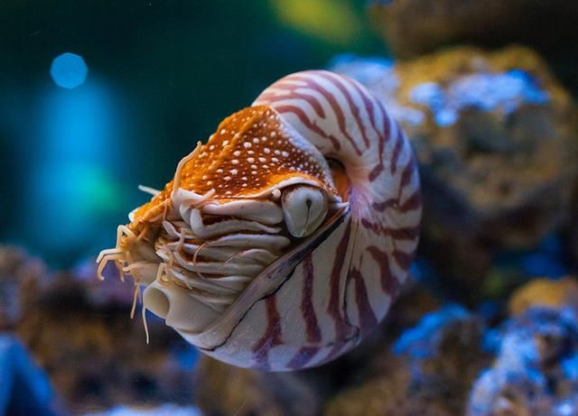 The nautilus, a marine mollusk, inhabits the steep slopes of coral reefs in the Indian Ocean and the western and central Pacific. Fossil records indicate that this species has existed for over 500 million years, surviving multiple mass extinctions and significant environmental changes. Unfortunately, it is now facing the risk of extinction due to human activities such as overfishing.