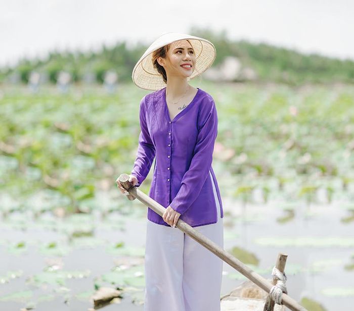 While the áo tứ thân exudes elegance and gracefulness, the bà ba outfit is simple and familiar. This attire is commonly worn in the Southern region. It comprises a round-necked bà ba shirt cinched at the waist, paired with wide-legged silk trousers. Despite its simplicity, this attire accentuates the gentle beauty of the Southern riverine women.