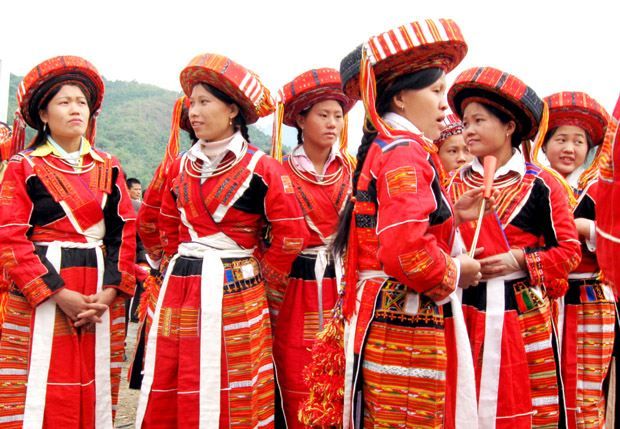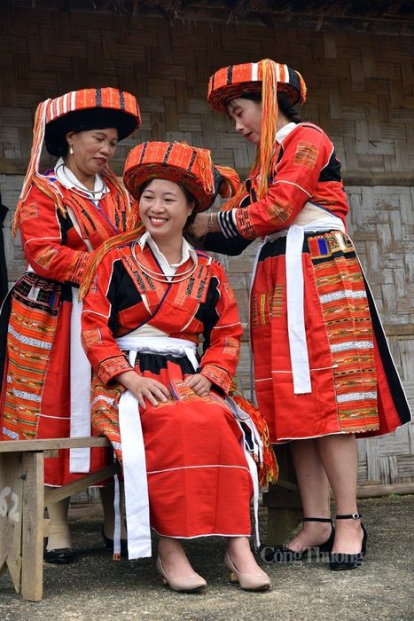 The traditional attire of the Pà Thẻn ethnic group serves not only to protect the body but also has distinct social and aesthetic functions. Nowadays, the traditional attire of Pà Thẻn women is largely unchanged, while men have undergone many changes. Women's attire typically includes a blouse, a bodice, a skirt, a scarf, and a waistband. Particularly, the attire of Pà Thẻn people often stands out due to their use of color. They predominantly use bright red, hence some ethnic groups refer to them as the Red Hmong. Additionally, Pà Thẻn women often use two types of waistbands: black and white. In their daily activities, they use black waistbands, while they use white ones for festivals or weddings.