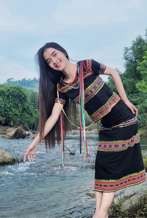 The traditional attire of the Cơ Tu ethnic group showcases unique characteristics in design, patterns, and decorative elements. It is a distinct beauty that leaves a different mark from other ethnic groups in the same region, especially in women's clothing. Cơ Tu women often wear their long hair tied up in a bun at the back of the neck or let it flow freely. In the past, they used to go bare-chested, only wrapping a piece of cloth like a bodice to cover the chest. Cơ Tu women wear short skirts down to the knees and layer them with an outer cloak. They typically wear a round-neck blouse with a scooped neckline and short cuffed sleeves. The blouse is adorned with red and white patterns on a black background at the shoulders, chest, sides, and hem. The short skirt is constructed similarly, with two narrow fabric pieces folded into a tube shape.