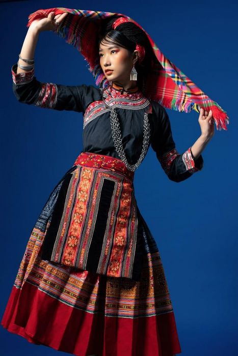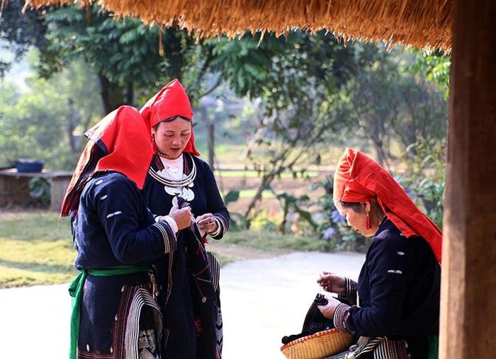 The Dao Đỏ people highly value dressing, hence the traditional attire of the Dao Đỏ ethnic group is meticulously crafted, from the stitching to the weaving and dyeing of fabrics, and the intricate embroidery of patterns. A complete traditional outfit for Dao Đỏ women includes a shirt, hat, trousers, belt, and leg wraps. Their shirt is a long-sleeved garment, with cuffs and edges adorned with red Thổ motifs meticulously embroidered on a black background. The trousers, in deep black, feature embroidered patterns, with the skill of a woman demonstrated by the patterns on her trousers. The striking red headscarf serves as a focal point for the entire attire, as well as a distinctive feature of the Dao Đỏ people.