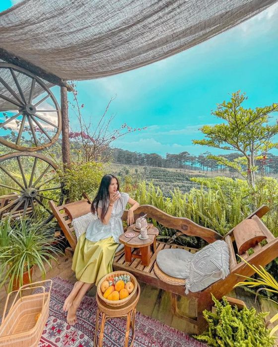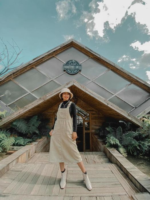 This coffee shop is designed as a glasshouse like the vegetable and flower gardens commonly seen in Da Lat, reinforced with sturdy wooden frames protruding from a small mound of land. The interior is decorated in an old style, creating a comfortable feeling for guests to leisurely enjoy coffee while admiring the scenery. Being a glasshouse, even in the chilly early winter weather, you can still bask in warm sunlight. Moreover, at Tui Mo To Cafe, you can enjoy a beautiful view of the vegetable gardens below, perfect for photo opportunities. Therefore, it's no surprise that this cafe always attracts many tourists to visit and relax whenever they come to Da Lat.
