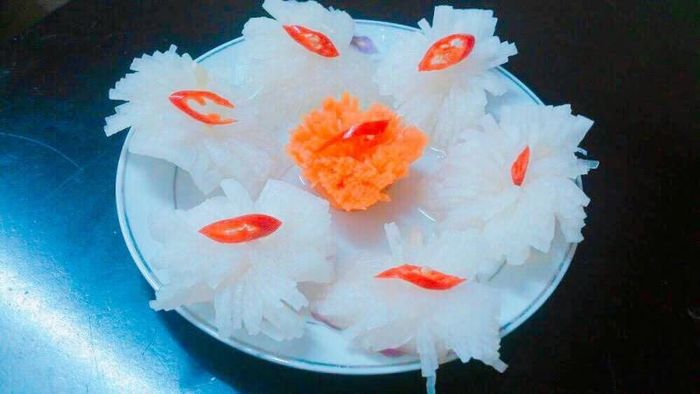 The pickled vegetable medley comprising carrots and white radish or papaya offers a delightful crunch with a harmonious blend of sweet, sour, and salty flavors, reducing the greasiness of oily dishes. The slender strips of carrots and white radish, or papaya, soak up the tangy, spicy, and sweet marinade, creating an inviting aroma with every bite. Prepare the following ingredients: large carrots, white radish or papaya, garlic, salt, sugar, vinegar, and fish sauce, finely sliced or cut into decorative shapes. Mix equal parts of vinegar, sugar, fish sauce, and water in a saucepan and bring to a boil. Turn off the heat, add thinly sliced garlic into the mixture, and let it cool, creating the pickling liquid. Place the carrots and white radish or papaya into a glass jar, pour the pickling liquid over them, and leave them for a day. Your tantalizing dish is ready to accompany your family meals.