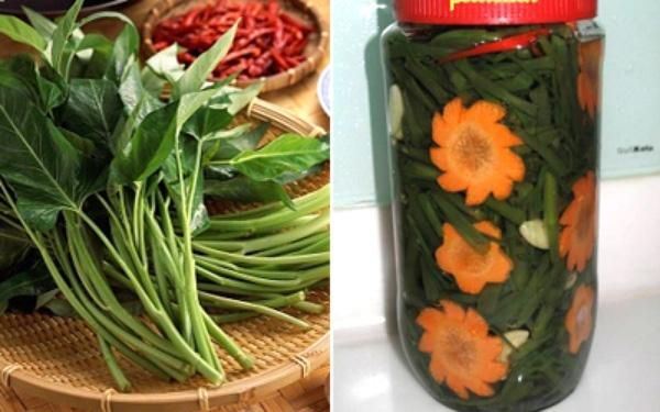 Water spinach pickles have a tangy flavor, and their affordability makes them a popular choice. Just a bunch of water spinach can yield several servings of pickles. Water spinach aids digestion due to its high fiber content, treating digestive disorders effectively. Its antioxidant properties help prevent common types of cancer, and when pickled with water spinach, the high vitamin C content boosts the immune system, benefits cardiovascular health, and aids in weight loss by burning excess fat. Ingredients include: 1 bunch of water spinach, chili peppers, garlic, carrots, vinegar, and sea salt. Pickling the leaves saves both money and provides additional minerals beneficial for the body. For an even better dish, remove the leaves and use only the stems for crisp, green pickles. Boil briefly for 3-5 minutes and plunge into ice water to retain crispness and color. Then pickle with carrots in a clean glass jar containing a mixture of water, salt, sugar, vinegar, garlic, and chili peppers. This dish requires only a day for fermentation before consumption.