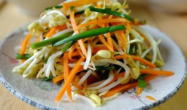 Bean sprouts are a common ingredient in daily family meals, aiding in digestion and promoting good absorption, preventing bloating when consuming large amounts. Rich in nutrients and vitamins, high in protein (equivalent to milk) yet low in calories, suitable for those on a weight loss diet. This pickled bean sprout dish is quick to make, with ingredients seemingly more abundant than pickled cabbage. When consumed, the tangy taste of ginger, scallions, and the sweetness of bean sprouts and carrots complement each other, with vibrant colors adding visual appeal. Prepare the following ingredients: plump bean sprouts, fresh scallions cut into sections, shredded carrots, salt, sugar, vinegar, chili, and garlic. Mix the bean sprouts, carrots, and scallions together, then place them in a clean jar and pour the prepared liquid over until the bean sprouts are submerged. After one day, they are ready to be enjoyed.