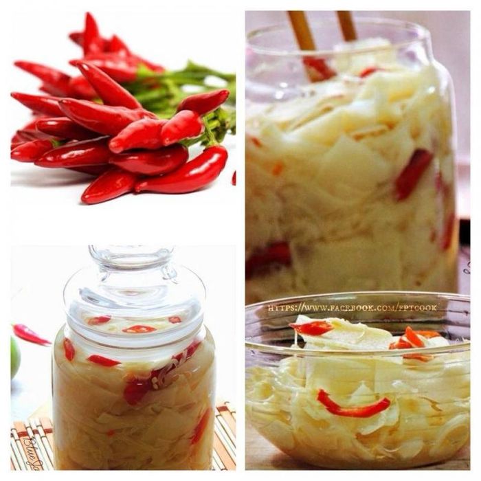 Sour preserved bamboo shoots are highly favored by many, especially those who enjoy spicy food. Paired with instant noodles alone, sour bamboo shoots can alleviate the greasiness of the noodles or stir-fried with various meats like pork liver, chicken, and fat to reduce their richness. The sour and spicy flavor of bamboo shoots, crunchy and stimulating to the palate, will surely leave you in awe, adding an interesting twist to your meal. Although bamboo shoots have a slightly bitter-sweet taste, once fermented, this characteristic flavor disappears, but its beneficial effects remain. This dish is known for its ability to resolve dampness, clear heat, aid digestion, detoxify, promote urination, and bowel movements. It is often used as both food and medicine for those suffering from heat-related illnesses, respiratory tract infections with yellow phlegm, edema due to kidney inflammation, heart failure, malnutrition, measles, and chickenpox in children, high fever with excessive thirst, slow digestion, difficult urination, and constipation. Ingredients include fresh bamboo shoots, vinegar, salt, sugar, garlic, and chili. Slice thinly to speed up the pickling process and briefly blanch in boiling water with a pinch of salt to reduce bitterness.