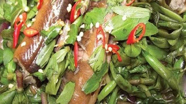 Eel can be used to cook various dishes, but in this rural area, there's a type of herb that, when combined, becomes an incredibly wonderful dish: sawtooth herb. This herb grows wild in areas with stagnant water, with green stems and leaves. The herb has a slightly bitter taste, but eel braised with sawtooth herb is a creatively prepared dish that delights many travelers.