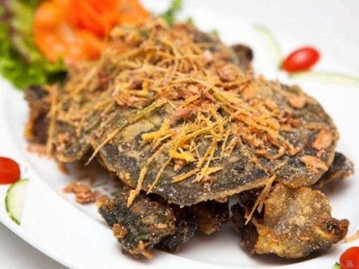 Returning to the dish of salted fried turtle. Locals in Ca Mau believe that only yellow and shell turtles are delicious when fried with salt. The salt used must be rock salt, and the pot must be clay to ensure that the fried turtle meat is perfectly flavored. The turtle meat is firm and crispy, and thanks to frying with salt, it becomes sweeter and more fragrant. This is considered one of the specialty dishes served to guests. If you have the opportunity to visit Ca Mau and are treated to salted fried turtle, then you are definitely a special guest in their hearts.