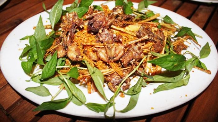With its preference for vegetables and starch, field mouse meat is chewy and fragrant. After trapping, field mice are kept for a day to naturally eliminate impurities before being processed into meat. Once cleaned, the field mouse is drained, chopped, marinated with finely chopped lemongrass, along with delicious fish sauce, MSG, a pinch of salt, sugar, and left to marinate for 15 minutes. Then it's fried in hot oil over a moderate flame, continuously flipped to ensure even golden cooking. When served, spicy lemongrass fried field mouse is accompanied by various greens such as lettuce, cucumber, tomatoes, etc. This dish, when paired with hot rice, is truly a match made in heaven.