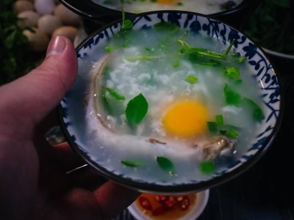 Keo fish porridge is a common dish in Ca Mau. After being caught, keo fish are cleaned with charcoal and salt to remove mucus. The white porridge is cooked from rice soaked overnight, seasoned with salt, sugar, fish sauce, ground pepper,... and the keo fish is added last, when the porridge is almost cooked, and cooked until the porridge expands completely, and the fish is just cooked, the flesh is still intact and not mushy. When enjoying, diners are instructed to add a little bitterweed and ground pepper at the bottom of the bowl, then pour the hot keo fish porridge on top. The heat of the porridge will make the vegetables at the bottom crispy and still maintain a certain freshness. Additional fish sauce or soy sauce can be added according to taste. This dish is quite nutritious and easy to enjoy. When enjoying, you can also add a native chicken egg to increase the nutritional value of the dish.