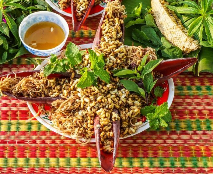 Young bee salad is loved by many for the fresh and fatty taste of young bees, along with the unique flavor and new experience when enjoying it. Harmonizing with the fatty taste of young bees is the right amount of sour and spicy taste of fish sauce, or vinegar sugar water, the crispy and fragrant taste of banana blossom or young coconut core, combined with various herbs... will bring diners an explosion of flavors when enjoying. If you have a chance to visit the U Minh forest, you must try this dish.