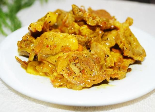 Serve the turmeric braised pork hot with steamed rice for the perfect meal.