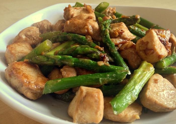 Chicken is rich in protein, vitamin B6, vitamin A, phosphorus, and minerals that are beneficial for teeth, bones, and the cardiovascular system. The amino acid tryptophan in chicken also helps reduce stress, preventing depression during pregnancy. On the other hand, asparagus is packed with folic acid, which supports blood production and promotes milk production.