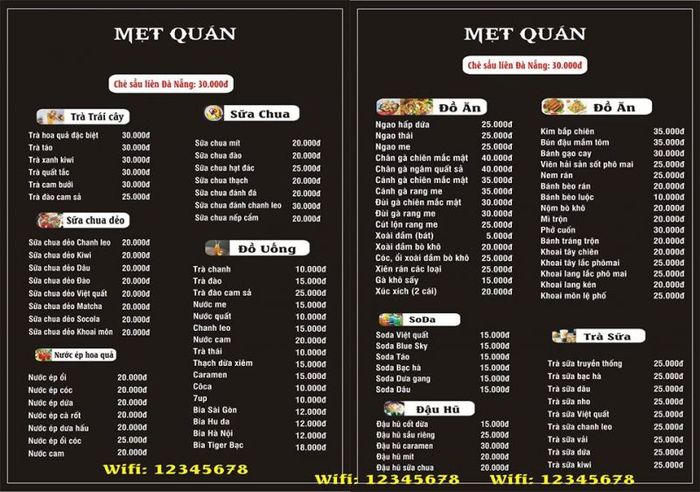 Mẹt Quán Ha Tinh, located on Dong Que Street near Nam Ha Middle School, is a popular spot for local students. What sets this place apart is that all the food and drinks are displayed on traditional trays, offering a wide variety of choices such as yogurt, chewy yogurt, fruit teas, fried chicken feet, pickled chicken feet with lemongrass and lime, tamarind fried chicken legs, quail eggs, fried kimbap, spicy rice cakes, fried spring rolls, and more.