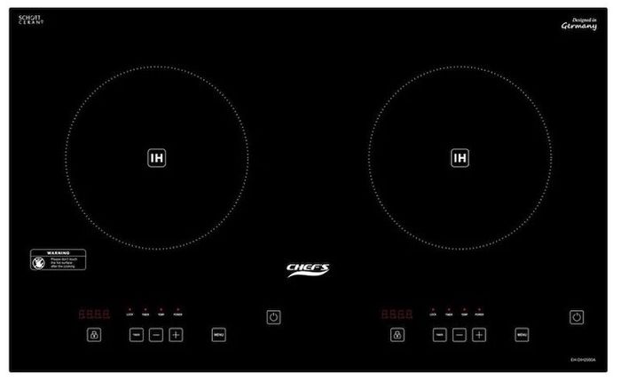 - Chef’s EH-DIH2000A induction cooktop features exquisite, modern, and luxurious design, with 2 cooking zones conveniently enhancing the aesthetics of the family cooking area.