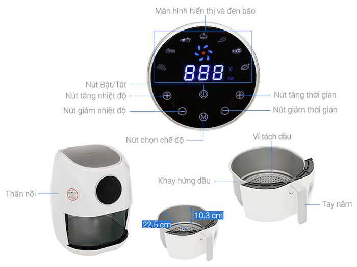 - Capacity around 5 - 10 liters: Suitable for households with 4-7 people, capable of frying a whole chicken or duck or about 1.5kg of food.