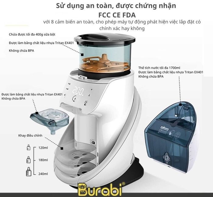 - It has many advantages in design and functionality similar to Burabi Plus, such as: fast milk brewing time; milk brewing temperature range from 35°C to 70°C; capable of brewing over 5000 types of formula powdered milk and Japanese milk; connects to personal smartphones and is equipped with many other utilities such as automatic cleaning, night light, etc. However, the product has a more compact design, with an additional door to protect the milk brewing chamber from insects, dust. It also has an additional external water suction cord design for convenient automatic heating and cleaning, thus saving more milk brewing water.