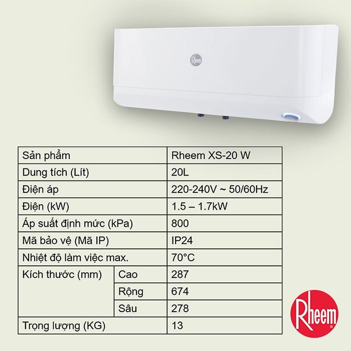 The Rheem Xwell Slim XS-20 20-liter horizontal hot water tank is currently available on the market with an average reference price of 3.7 million dong.