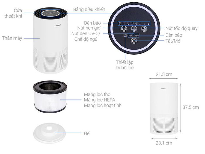 The Hafele CF-8116 boasts a compact, elegant design in a sophisticated grey-white palette, perfect for modern apartments. It's ideal for areas between 20 – 25m2, featuring four speed levels and three timer settings, equipped with multiple filtration layers including an outer filter, HEPA filter, and UV light for efficient air purification.