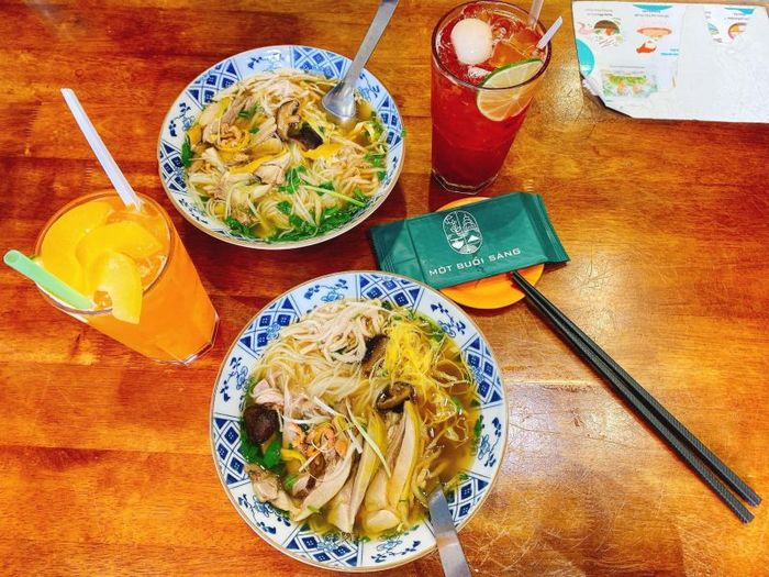 Một Buổi Sáng is a well-known name, especially among young people. The standout feature of their bún thang is that it contains no sugar or MSG. The broth is made entirely from natural ingredients, with the rich flavor coming from long hours of simmering bones and fresh ingredients. The bún thang here comes with a variety of toppings, such as noodles, chicken, eggs, Vietnamese sausage, mushrooms, spring onions, and Vietnamese herbs, all beautifully arranged in the bowl. The steaming bowl of bún thang in the morning is the perfect way to kickstart your day with energy. The restaurant's space is spacious and airy, with wooden furniture in a vintage style. The young and friendly staff provide attentive service.