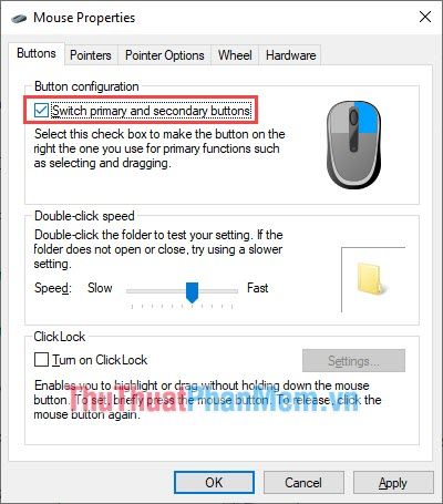 Step 2: Then, check the box next to Switch Primary and Secondary Buttons to swap the two mouse buttons. Finally, press Apply -> OK to save your settings.