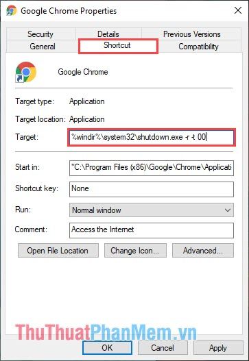 Step 2: Then, choose the Shortcut tab and paste the code below into the Target section. Finally, press Apply -> OK to save everything.