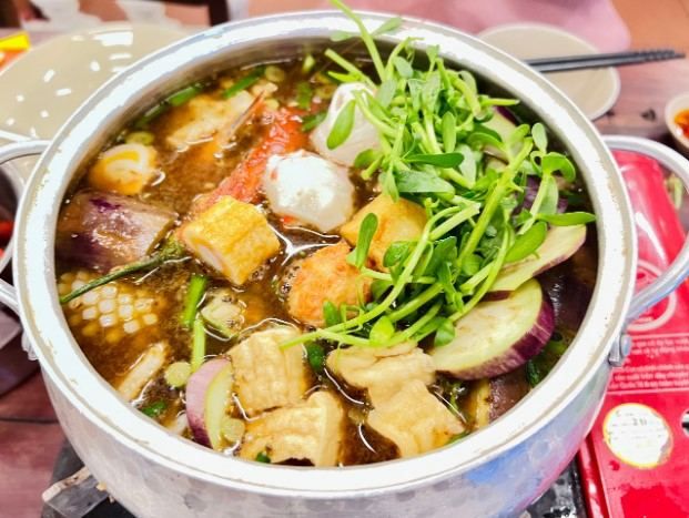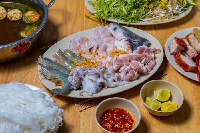 When talking about Bún Mắm or Lẩu Mắm, dishes that are deeply infused with the flavors of the Mekong Delta, locals in Tan Binh and Go Vap can't help but mention Bún Mắm - Lẩu Mắm Song Nhi, a place known for its authentic Southern-style Bún Mắm and hotpot. Many people think of Lẩu Mắm as a salty dish, but the version here is surprisingly rich and sweet with a depth of flavor that’s hard to resist. The broth is carefully crafted to balance the tastes of the North, Central, and South, creating a flavor profile that is not as salty as one might expect from a typical Southern hotpot. The dish beautifully blends the flavors of different regions, offering a unique and complex taste.