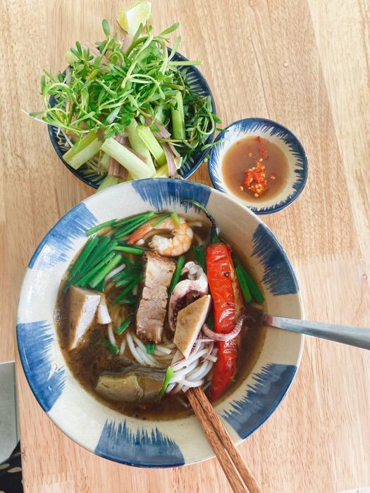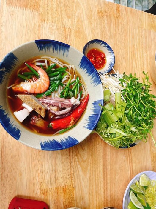 The Bún Mắm here includes a variety of ingredients like fish paste from local species such as the linh, snakehead, and sac fish. The broth has a natural sweetness from pork bones, fish, shrimp, and squid, with a fragrant hint of lemongrass. The bowl is topped with a variety of ingredients like pork, shrimp, fish cakes, squid, and more. The dish is beautifully garnished with eggplant, water spinach, banana blossom, lotus flowers, and bitter herbs. The seafood and river fish add a sweet, delicate taste, complemented by the spicy kick from lemongrass and chili, with the fermented fish paste adding a savory depth. Their Bún Thái is highly rated for its rich, flavorful broth, and fresh, delicious seafood. This dish is perfect when paired with a bit of fresh greens.