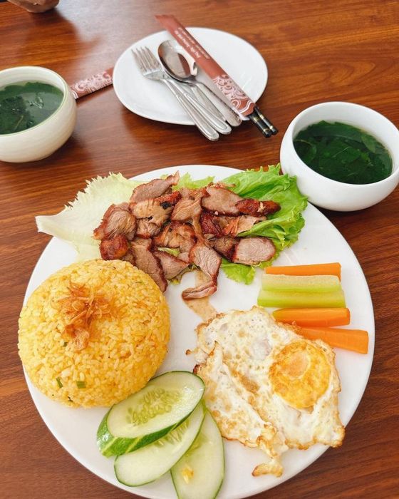 Tam Bistro is another popular and affordable rice spot in Hoa Binh, beloved by locals in the Hoa Binh City area, particularly those living around Chi Lang Street. The space here is simple, with basic plastic tables and chairs, yet it is clean, airy, and well-organized to accommodate customers. As for the food, the broken rice served here is not only flavorful but also beautifully presented, making it even more appetizing.