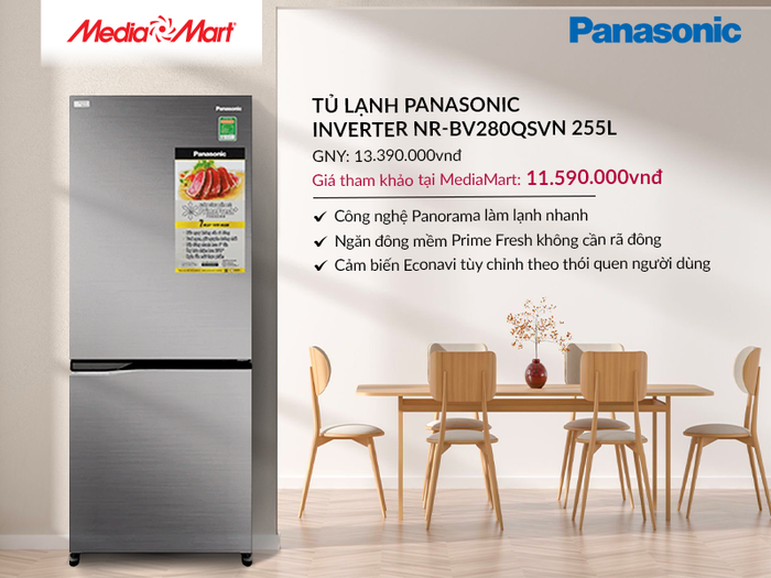 With a considerable price reduction for this Lunar New Year period, the Panasonic Inverter 255L NR-BV280QSVN refrigerator is currently discounted from 13.39 million VND to 11.59 million VND.