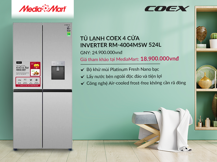 The listed price of the Coex RM-4004MSW 4-door Inverter refrigerator is 24.9 million VND. However, this price is reduced to 18.9 million VND when purchased at Mytour. This product impresses with its luxurious, elegant design that is sure to satisfy even the most aesthetically demanding customers.