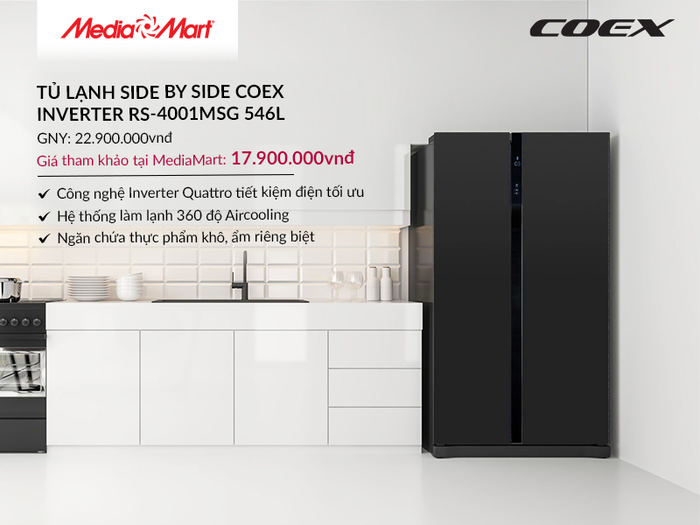 The Coex Inverter RS-4001MSG 546L refrigerator, originally priced at nearly 23 million VND, is now discounted to only 17.9 million VND at Mytour electronics supermarket.