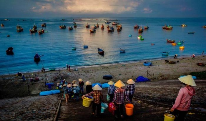 Surrounded by towering coconut trees and nestled along Huynh Thuc Khang Street, Mui Ne Fishing Village exudes a unique charm from dawn to dusk. From above, the familiar sight of fishing boats scattered along the shore is contrasted by vibrant blue round boats. If you take a short walk down a stone staircase, you’ll find yourself in a bustling fish market. Here, locals cast their nets early each morning and trade fresh seafood like crabs, prawns, and fish brought in by the boats. The busy market scene continues day after day in a cycle. From 5:30 to 6:00 AM, fishing boats and round baskets return, bringing in large catches, with strong fishermen unloading their night haul onto large mats laid out on the sand. Although Mui Ne Fishing Village mainly serves the local community, tourists also flock here to buy fresh seafood or have it cooked on-site.