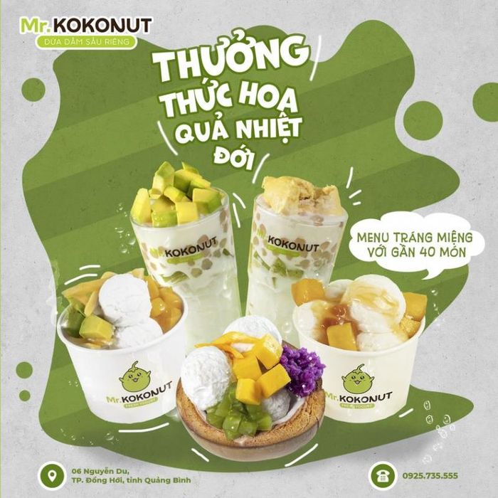 Mr. Kokonut Dong Hoi offers a variety of desserts, coconut sticky rice ice cream, tofu pudding, yogurt ice cream, and more, combining different ingredients with coconut to create a unique flavor when visiting this place. The desserts, yogurt, and coconut sticky rice ice cream are combined with a variety of fruits. The charm of the place lies not only in the delicious flavors created by the high-quality ingredients but also in the excellent decoration and alluring fragrance. The venue is meticulous in selecting ingredients, ensuring the highest quality for the dishes served to customers.