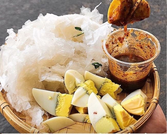 Bánh Tráng Trộn Bo Béo is one of the most famous bánh tráng spots in Ho Chi Minh City, earning rave reviews since its inception. It offers a tempting menu of bánh tráng-based dishes that are beloved by snack enthusiasts in Saigon, with the bánh tráng dipping being the standout. When you try it, you’ll experience the perfect combination of soft, chewy bánh tráng, rich quail eggs, and tangy mango. But it doesn’t stop there – their special dipping sauce, featuring green and red salt lime sauces along with tamarind and a hint of spice, takes the flavors to a whole new level.
