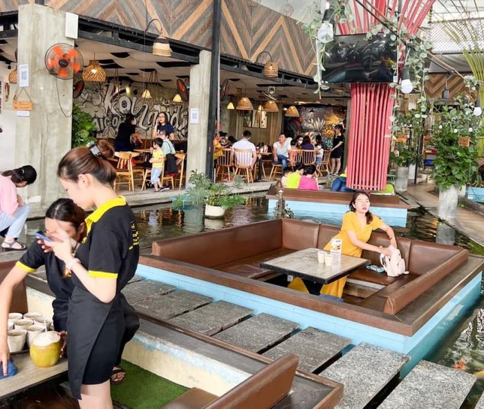 Koilands Coffee is a café that doesn’t sit on a river, but still offers the unique experience of sitting in a boat—specifically, the traditional round fishing boats used by fishermen in coastal areas. With an area of nearly 200m2, the café spans two floors, and houses five of these iconic Phan Rang fishing boats (from Ninh Thuan) that have been transformed into cozy seating. The owner bought these boats for 5 million VND each, repurposing them into seats covered with leather and lined with cushions at the bottom, with metal railings for back support.