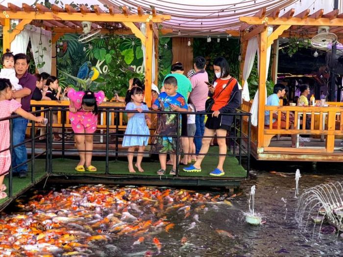 The boats are coated with waterproof varnish and placed on metal stands elevated above the water, ensuring durability and preventing damage from constant exposure to water. Each boat can seat 5-7 people, and customers are always amazed at how these humble fishing boats have been cleverly turned into comfortable spots for enjoying coffee. Beneath the boats, there’s a pond with Koi fish swimming, so you can enjoy your coffee while watching the fish, or even feed them as food is provided for guests to share. Aside from the boat area, Koilands Coffee also has a charming spot with a small bridge crossing over a pond, and an upstairs loft perfect for relaxing, ideal for families with children.